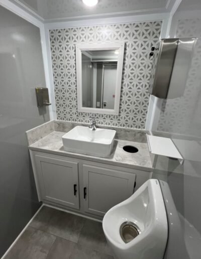 The Opulence 2-Station, formerly known as the Opulence II, contains one male restroom furnished with a sink, toilet, and urinal, as well as a female restroom with one individual restroom with a sink and toilet.